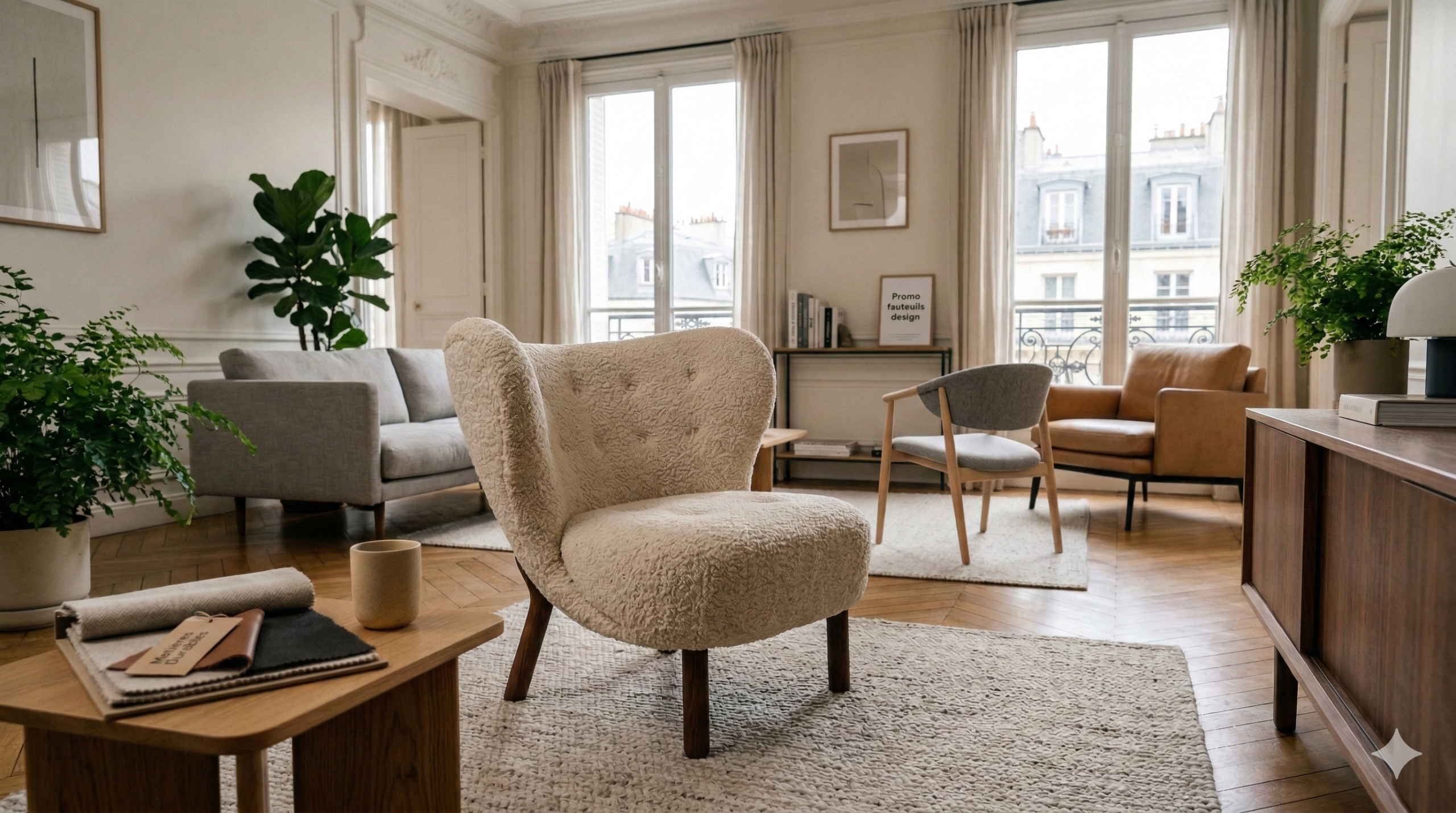 | 3 | Fauteuil lounge contemporain | Tissu gris + chêne | L 80 × P 85 × H 82 cm | 600 – 850 € |