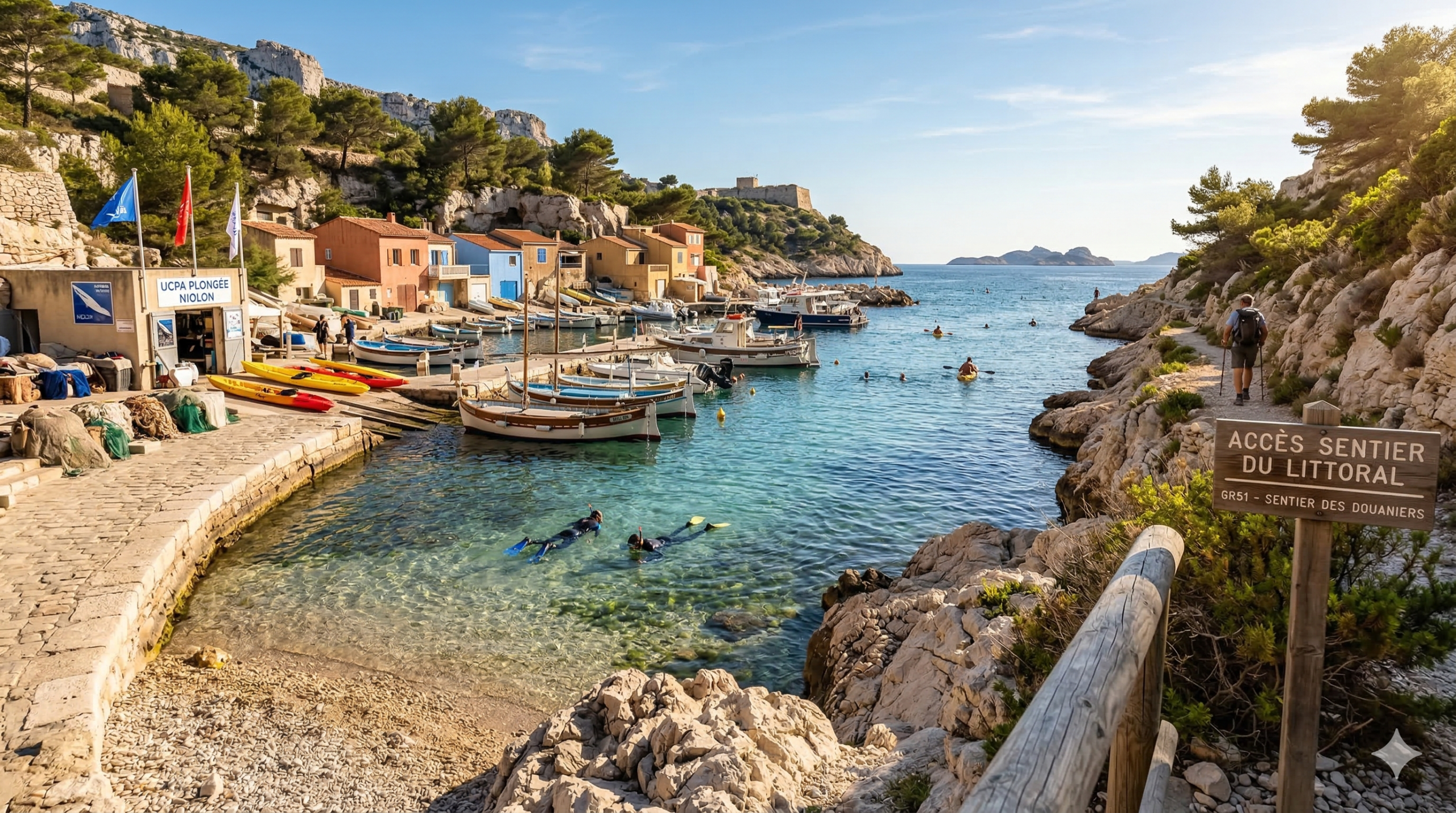Sur place, le temps ralentit. Quelques maisons traditionnelles et cabanons colorés descendent vers un petit port de pêche. Une seule plage, très étroite, accueille les baigneurs. La végétation de garrigue couvre les hauteurs, mêlant les odeurs de thym et de romarin à l’air iodé. Le village se visite rapidement à pied. L’atmosphère reste préservée, loin des flux touristiques massifs des calanques de Cassis. Niolon attire une clientèle de connaisseurs : randonneurs, plongeurs, photographes et familles en quête de nature vraie.