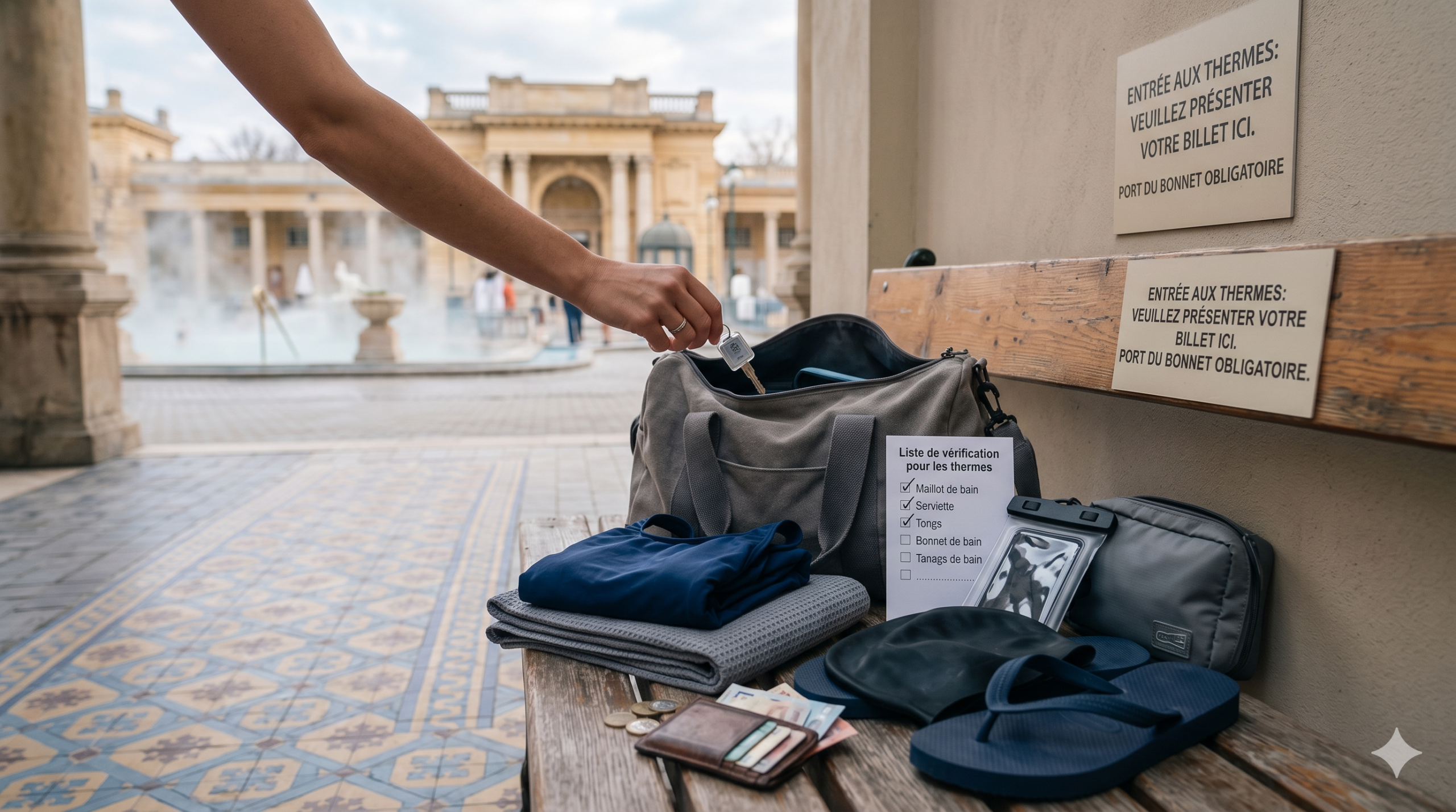 Emportez un maillot de bain, une serviette, des tongs et un bonnet de bain : ce sont les quatre incontournables pour profiter des thermes de Budapest sans mauvaise surprise. Que vous visitiez le célèbre Széchenyi, le Gellért ou le Rudas, la préparation reste la même.